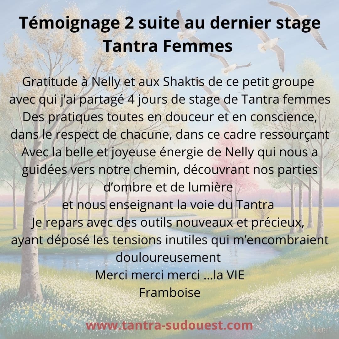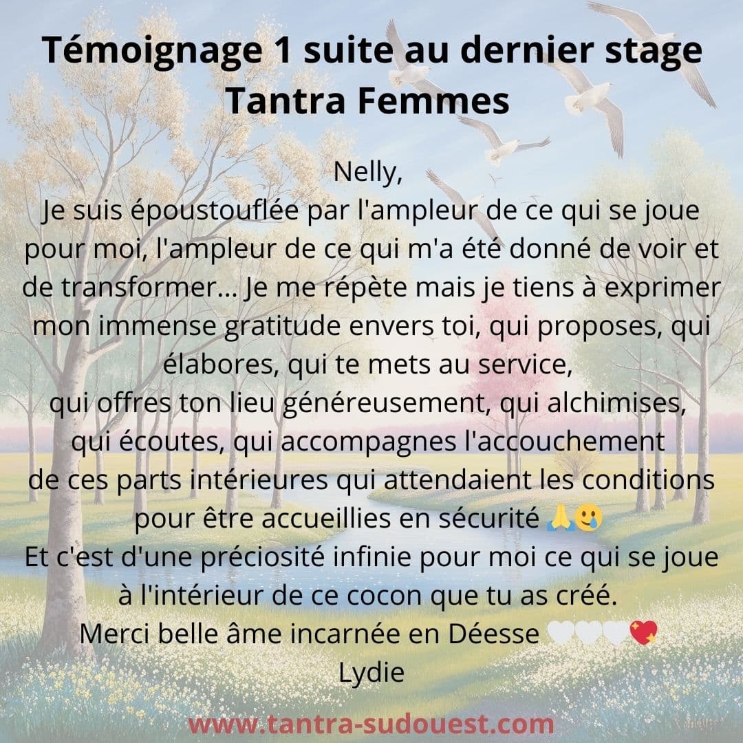 D’ailleurs c’est en rentrant du stage Tantra Femmes que j’ai dit Ă mon mari actuel que j’Ă©tais prĂȘte Ă me marier avec lui… et on l’a fait ! Dix-huit ans que nous vivons notre Relation, avec Amour, tendresse, joie, confiance… en nous laissant Ă©voluer et communiquer…